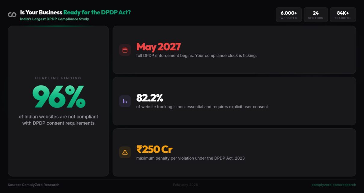 The research was conducted in February 2026 by ComplyZero Research, covering over 6,000 websites across sectors including government, banking, healthcare, education, media, and e-commerce. The report represents the most comprehensive analysis of DPDP cookie consent compliance conducted in India to date.