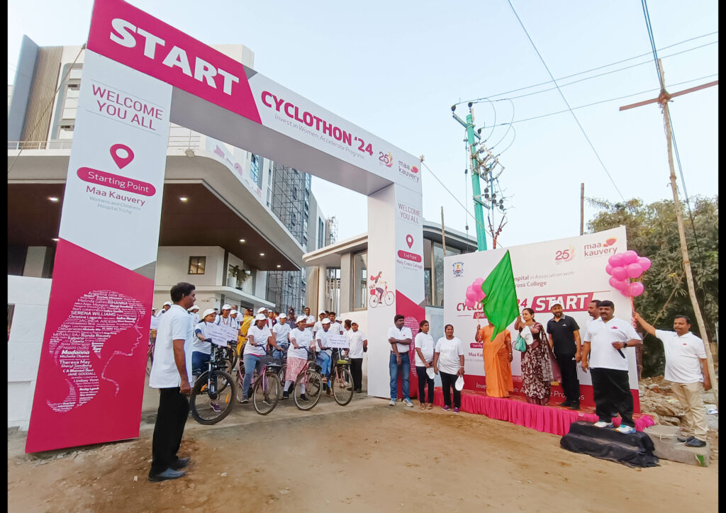 Trichy, 8th March, 2024 – In celebration of International Women’s Day, Kauvery Hospital Trichy joined hands with Holy Cross College to organize a Cyclothon, engaging over 100 women from the college.