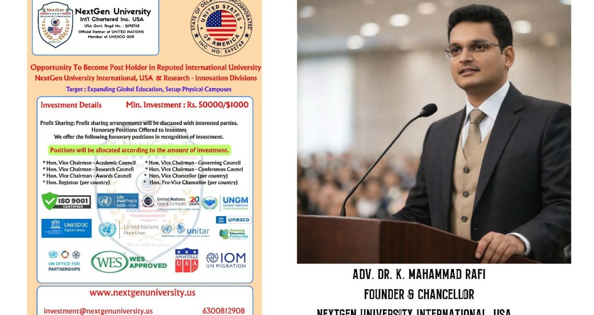 USA — Under the visionary leadership of Adv. Dr. K. Mahammad Rafi, Founder & Chancellor, NextGen University International, USA continues to expand its global academic footprint. Supporting this mission is Adv. Dr. Afreen Banu, serving as Global CEO, and Adv. Dr. Arif Nasir Butt, Chairman – Academic Council, who together provide strategic, academic, and operational leadership to the institution’s international growth and quality framework.