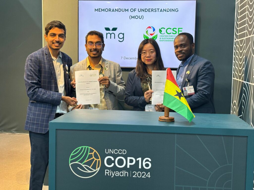 In a momentous collaboration unveiled at the United Nations Convention to Combat Desertification (UNCCD) 16th Conference of the Parties (COP 16) in Riyadh, Organic Microgreens Pvt. Ltd. (OMG) (India) and the Center for Climate and Sustainability Empowerment (CCSE) (Ghana) formalized their partnership with the signing of a Memorandum of Understanding (MOU). The collaboration aims to implement the innovative OMG Lab Initiative in schools across Ghana, focusing on sustainable farming, education, nutrition, and entrepreneurship.