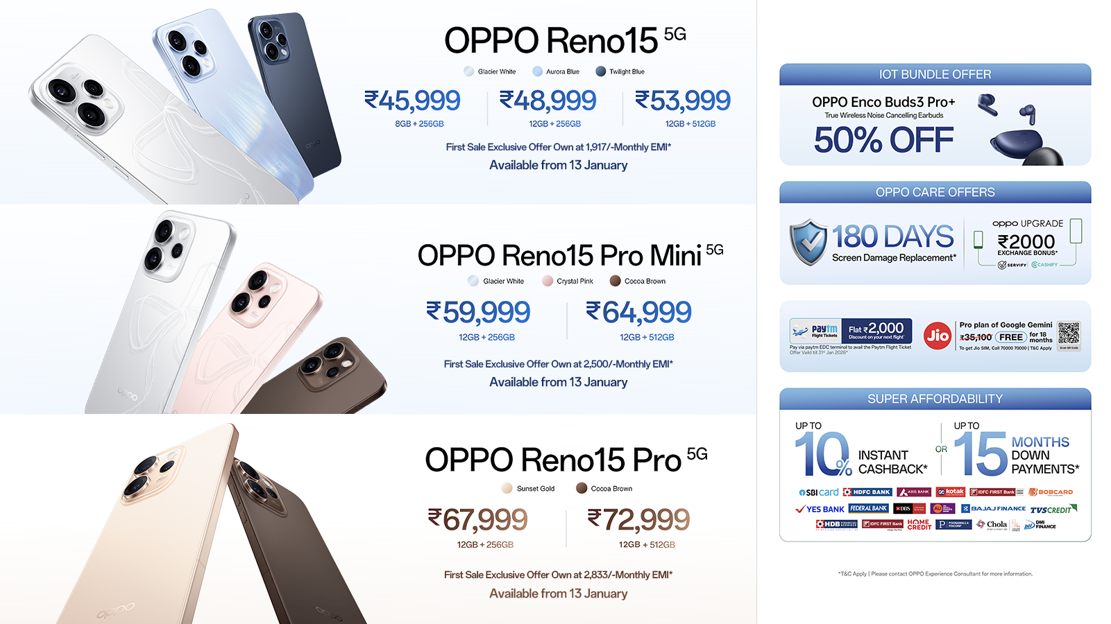 The Reno15 Pro is priced at INR 67,999 for the 12GB + 256GB variant and INR 72,999 for the 12GB + 512GB variant. The Reno15 Pro Mini is available at INR 59,999 for the 12GB + 256GB variant and INR 64,999 for the 12GB + 512GB variant. Meanwhile, the Reno15 is offered in three configurations, 8GB + 256GB at INR 45,999, 12GB + 256GB at INR 48,999, and 12GB + 512GB at INR 53,999. The OPPO Reno15 Series will be available for purchase starting 13th January 2026 with exciting offers on Amazon , Flipkart, Mainline Retail Outlets and OPPO E-store.