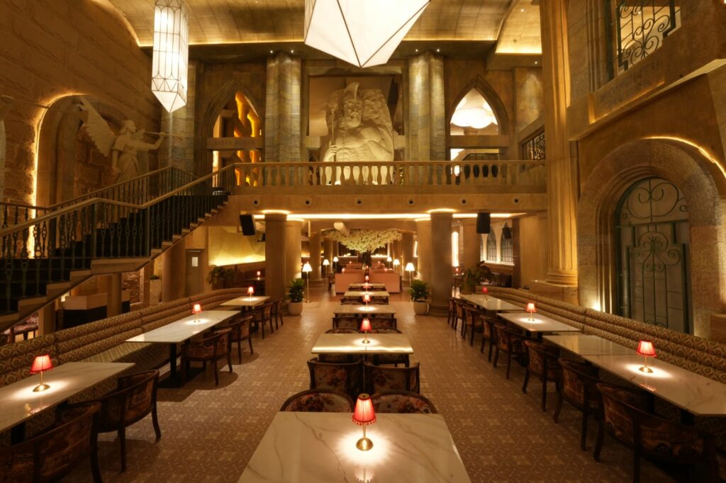 Small design cues reinforce the theme. A gladiator figure sets the tone at the entrance. Mythic creatures sit near fountains. Bartenders operate on an elevated bar that feels like a stage. For all this drama, the space remains functional. Aisles stay wide, lighting stays balanced and seating flows smoothly.