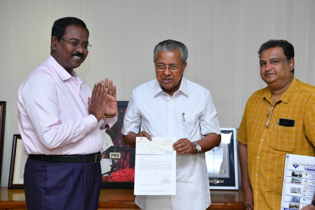 In a heartfelt gesture of solidarity, the Sri Venkateshwaraa Group of Institutions, Pondicherry, has extended its support to the victims of the recent Wayanad landslides in Kerala. A total donation of Rs. 7 lakhs was handed over to the Chief Minister of Kerala Shri. Pinarayi Vijayan to aid in relief efforts. This contribution comprises Rs. 1.65 lakhs raised by the students and faculty members, and Rs. 5.35 lakhs donated by the management of Institution’s Trust.