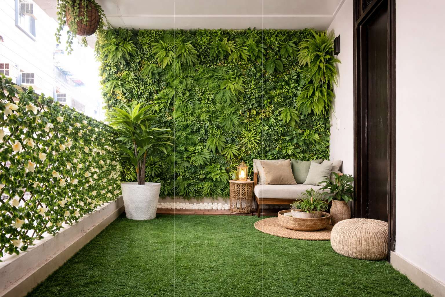 The first step in designing a balcony garden is choosing suitable flooring. Artificial grass is a popular option because it instantly creates the appearance of a natural lawn. It adds a fresh and vibrant feel to the space while remaining easy to maintain and durable for outdoor use.