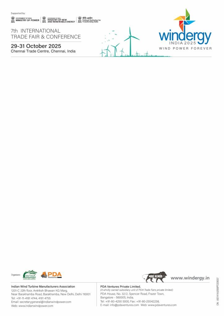 The 7th edition of Windergy India 2025, the exclusive international trade fair and conference for the wind energy sector in the country, is scheduled to take place this October from 29-31 at the Chennai Trade Centre. As India is making giant strides in wind energy generation, the event brings unparalleled opportunities to connect, collaborate and shape the future of renewable energy.