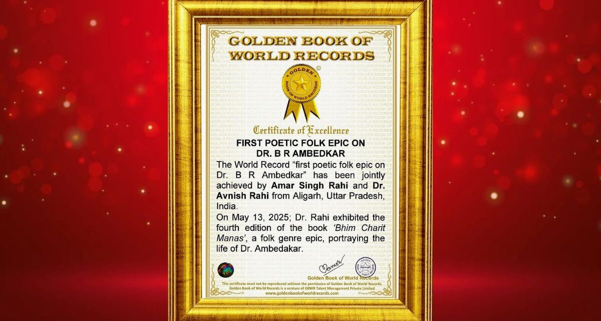 Aligarh, India: Aligarh has once again brought pride to the nation with a remarkable literary achievement. The father-son duo—renowned senior poet Amar Singh Rahi and Bharat Vibhushan lyricist Dr. Avnish Rahi—have authored the grand epic “Bheem Charit Manas”, which has been officially recognized by the Golden Book of World Records.