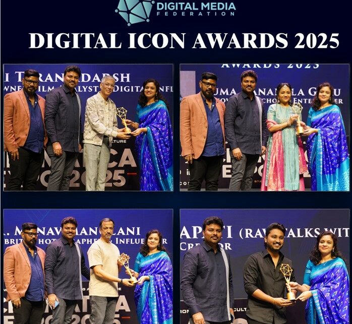 Hyderabad — The city witnessed a glittering celebration of India’s finest digital minds at the Digital Icon Awards 2025, held at HICC Convention Center, Hyderabad, in the presence of top creators, film and media personalities, and distinguished government officials. Organized by the Bharat Digital Media Federation (DMF) in association with Cinematica Expo and supported by the Government of Telangana and the Ministry of Information and Broadcasting, the event brought together India’s leading voices shaping the country’s digital future.