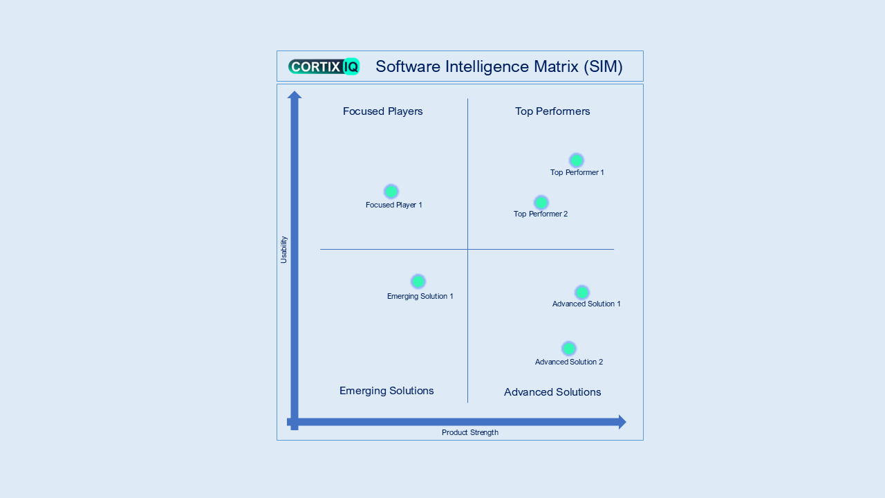 A key component of this intelligence-driven approach is CortixIQ’s Software Intelligence Matrix, a structured evaluation framework designed to categorize vendors based on their capabilities, innovation, and market impact. Within this matrix, vendors are positioned across four distinct segments: Top Performers, representing market leaders with strong execution and innovation; Advanced Solutions, highlighting platforms with high potential and strong capabilities; Emerging Solutions, showcasing innovative players gaining traction; and Focused Players, representing niche or specialized solutions addressing specific use cases. This framework provides both buyers and vendors with a clear understanding of market dynamics, enabling more strategic and confident decision-making.