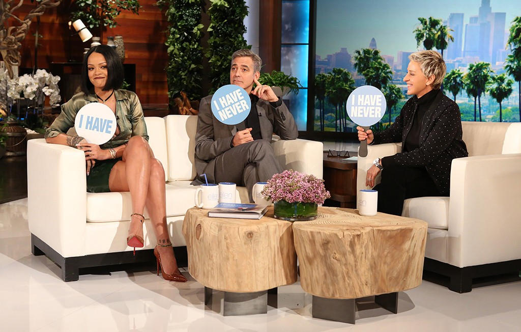 Watch George Clooney and Rihanna let slip round of Never Have I Ever on Ellen Show.