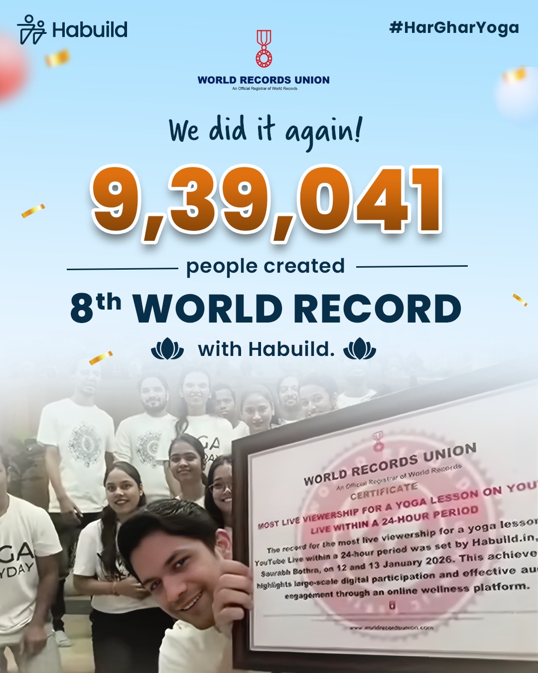 The record was created as a part of Habuild’s Har Ghar Yoga initiative. The theme for this year is designed around promises for new beginnings. Every New Year begins with promises like better health, more movement, calmer minds. Yet by mid-January, most resolutions fade away. In fact, the second Friday of January is often referred to as Quitter’s Day, when motivation dips and people are most likely to give up. This World Record is Habuild’s response to this moment.