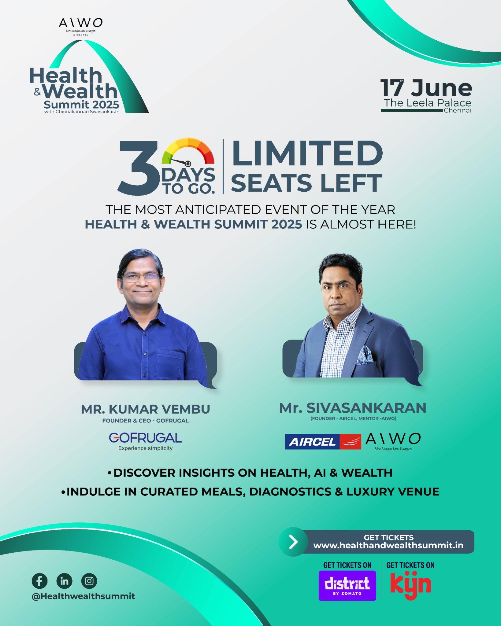 Chennai, India – In a world where health is the new wealth, AIWO proudly announces the Health & Wealth Summit 2025 — an exclusive, one-day summit designed to reshape the lives and mindsets of India’s most influential decision-makers. This is not just a summit. It’s a reset. A complete redefinition of how to live, lead, and perform—longer, better, stronger.