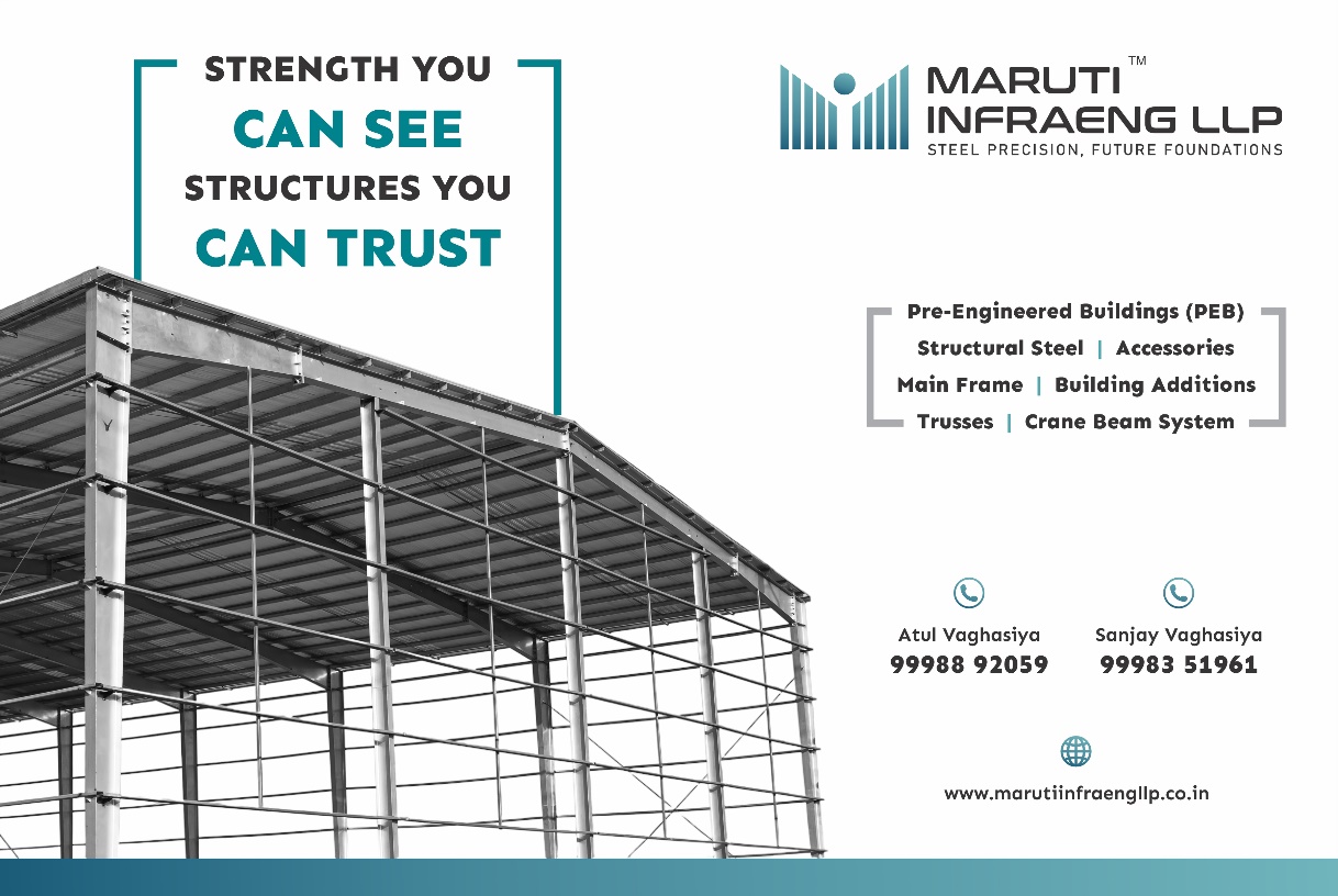 Maruti Infraeng LLP is a forward-looking steel-infrastructure solutions company based in Surat, Gujarat. It specialise in designing, manufacturing and installing high-quality Pre-Engineered Buildings (PEBs), structural steel structures, trusses, industrial sheds, prefabricated shelters and more. Our team of skilled engineers uses modern software tools and international standards to deliver structures that are not only robust and durable but also aesthetically pleasing. From initial design through fabrication, logistics and onsite erection, we offer end-to-end services — ensuring timely execution, reliability, and customer satisfaction. At Maruti Infraeng LLP, we believe in innovation, quality craftsmanship and building strong relationships based on transparency and trust.