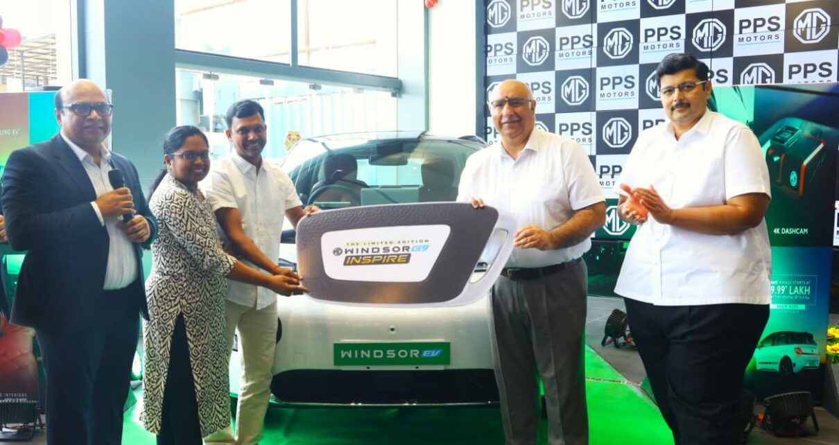 Hyderabad, October 15, 2025: PPS Motors today announced the launch of the Windsor Inspire Edition, a limited edition of India’s best-selling EV, built to celebrate one year of Windsor’s remarkable journey in the country at its LB Nagar showroom at Hyderabad. The Inspire Edition draws from the strong love and trust that the Windsor has received from customers, crossing the milestone of 40,000 units in less than a year. With only 300 units to be produced, the Inspire Edition is both a commemoration of the Windsor’s success and a symbol of the spirit of inspiration that continues to drive India’s electric mobility movement. PPS Motors delivered the first MG Windsor Inspire Edition vehicle in Hyderabad to a customer by Vinay Raina, Chief Commercial Officer, JSW MG Motor India, Rajiv Sanghvi, Managing Director, PPS Motors, in the presence of Saurav Prakash, Zonal Head (South), JSW MG Motor India, and other senior officials from both the organizations.