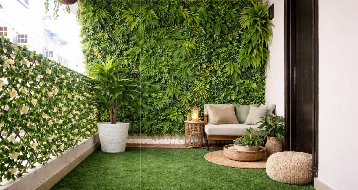 Finally, place artificial plants near railings or corners to complete the garden look. Artificial greenery is a practical solution for balconies because it stays fresh throughout the year and requires minimal care while still providing the beauty of natural plants.